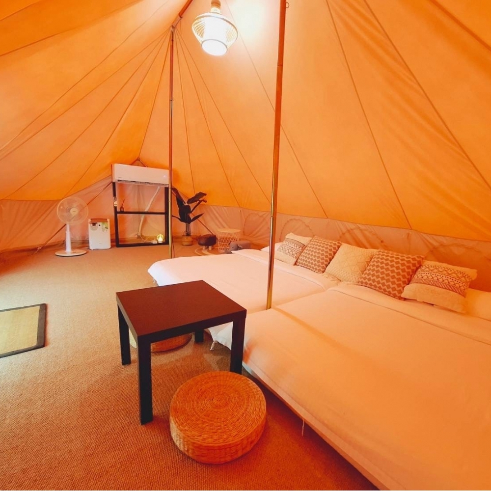 標準雙人床2套(含枕、被、床包)、小桌、內外照明燈、風扇、除濕機、冷暖空調。